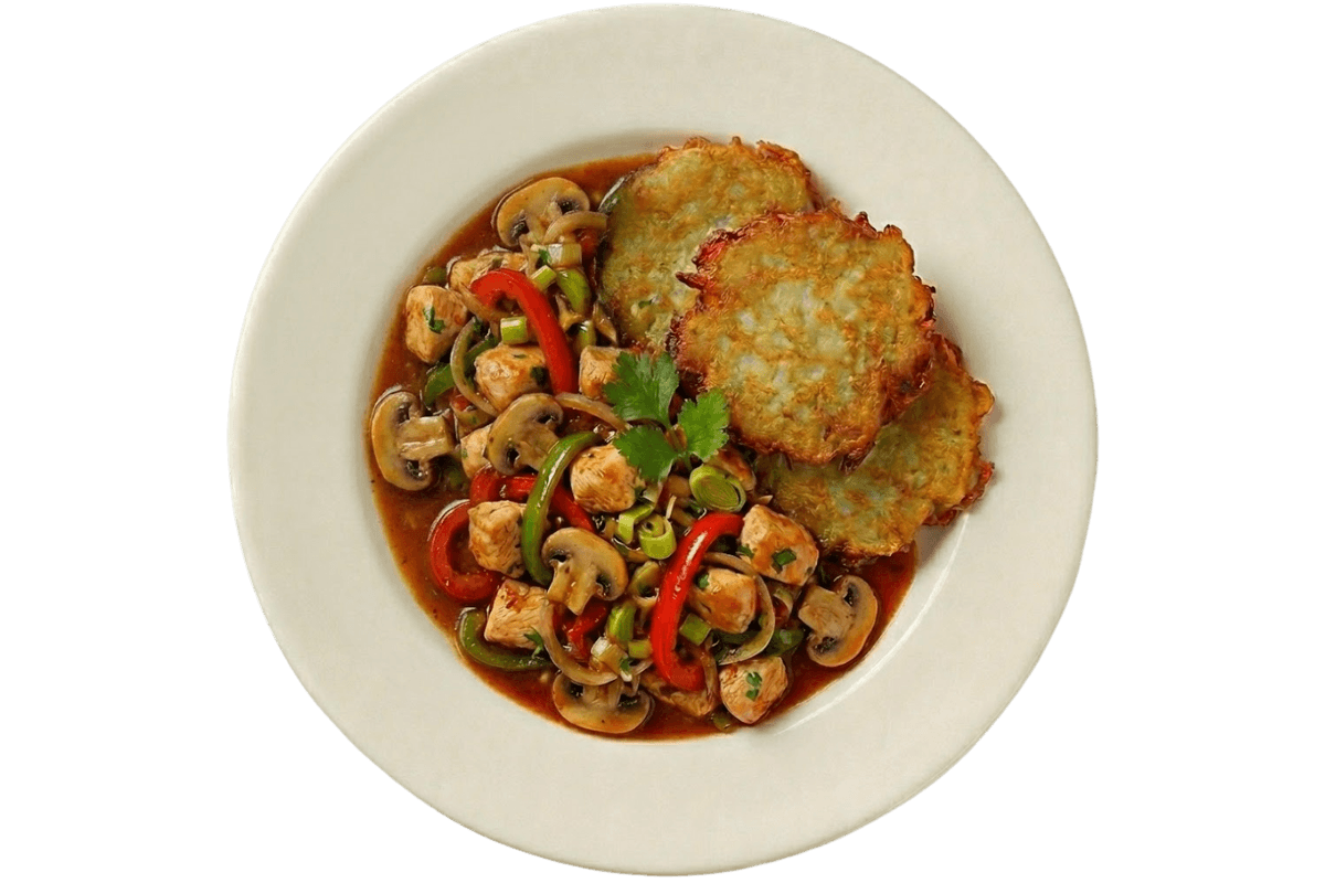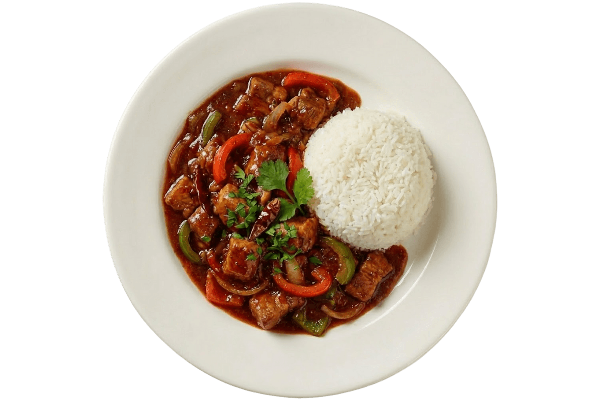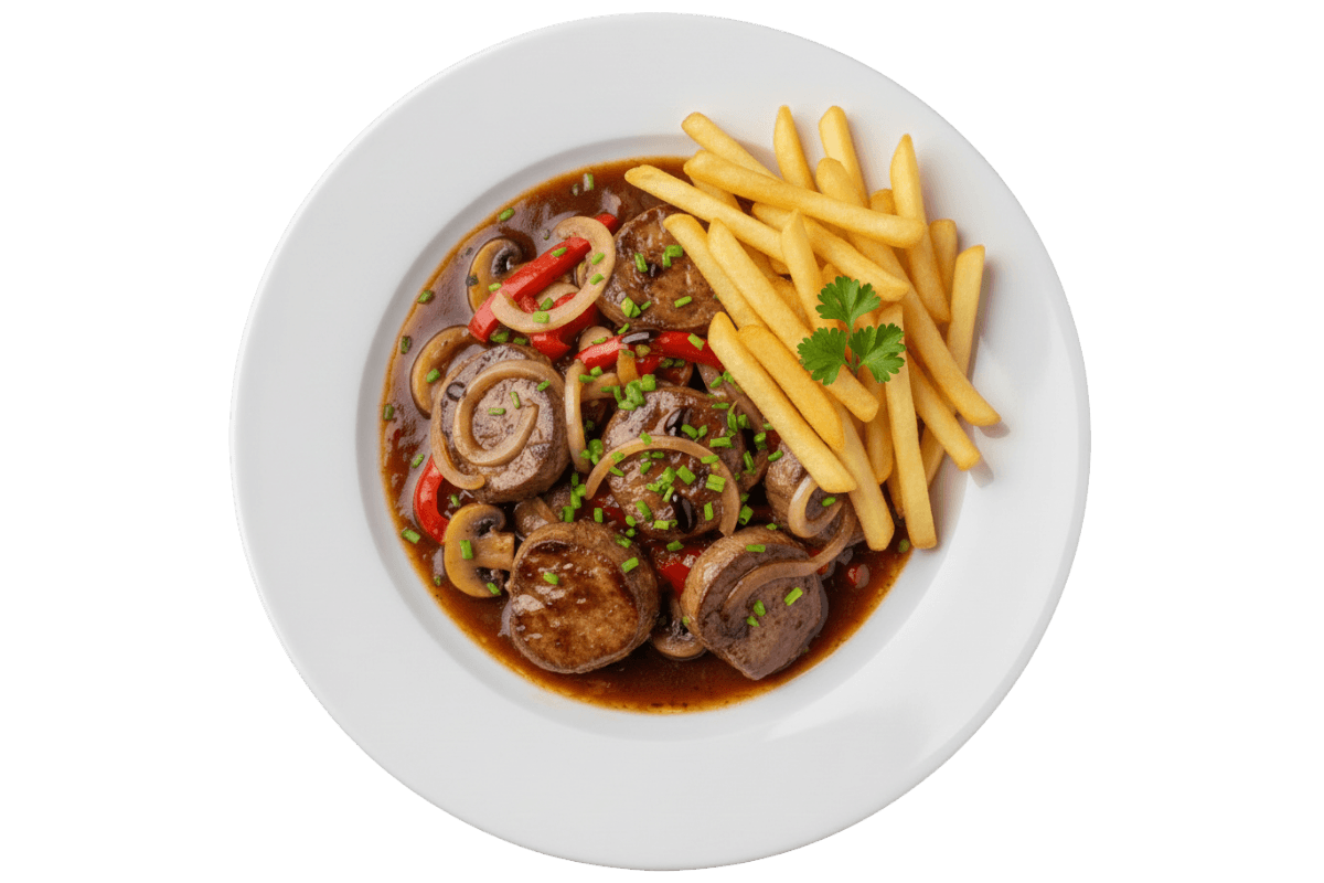 Vepřová játra, cibule, kapie, žampiony, kečup, soja