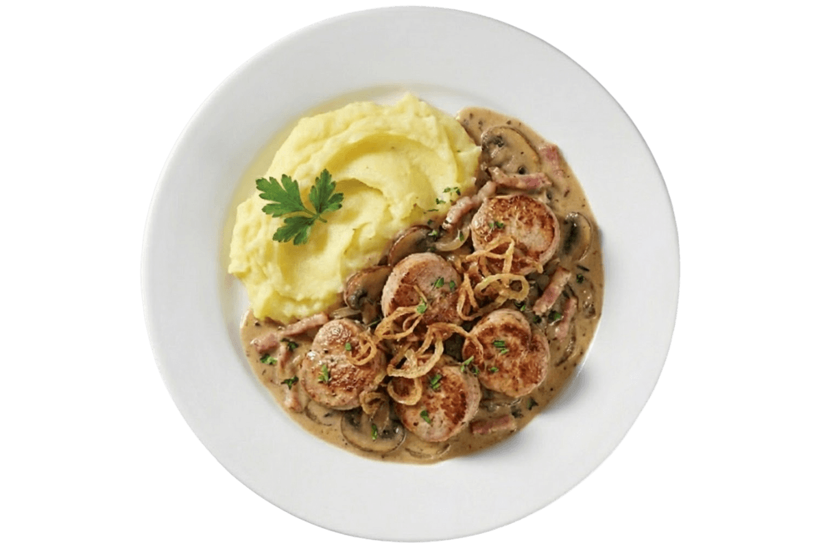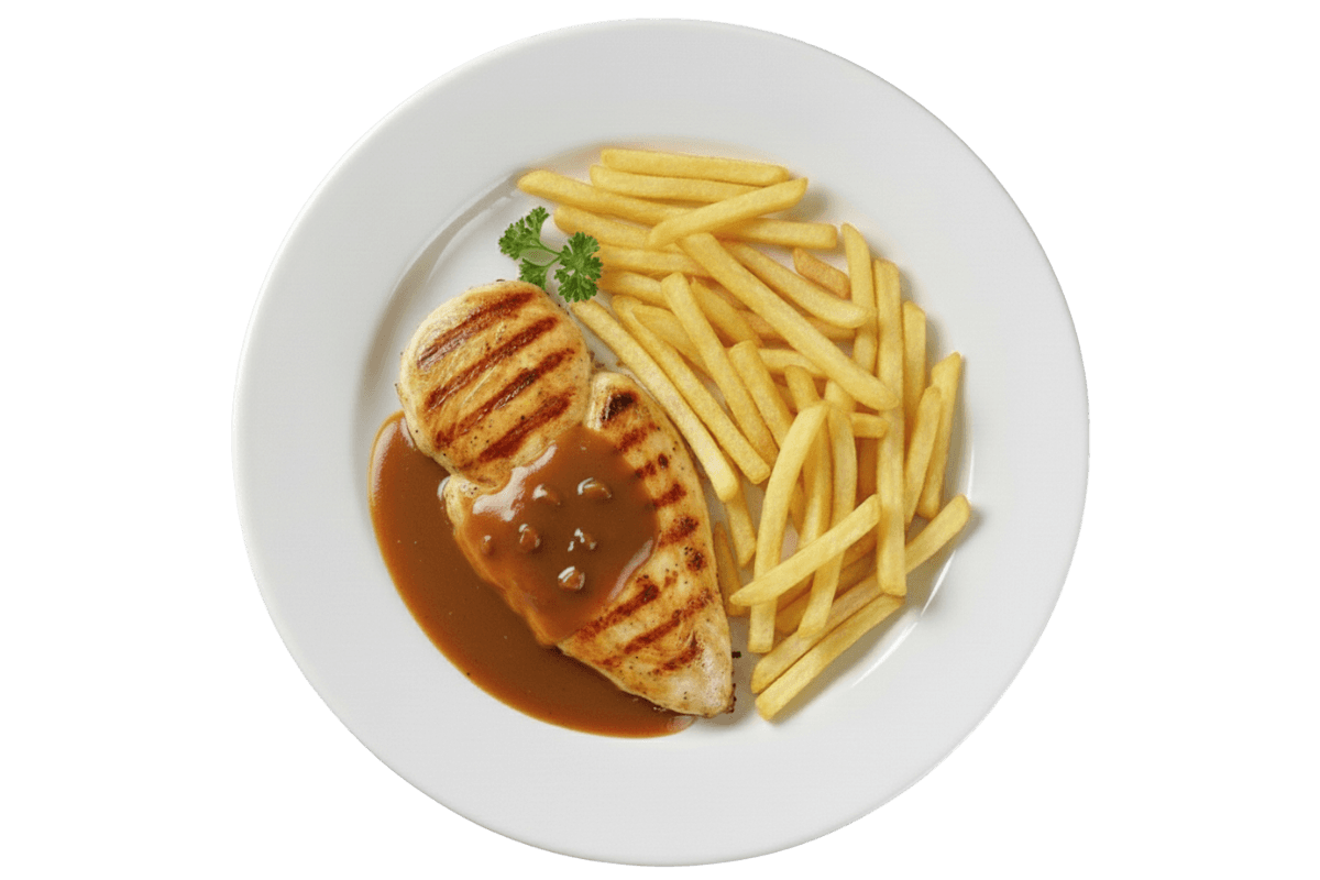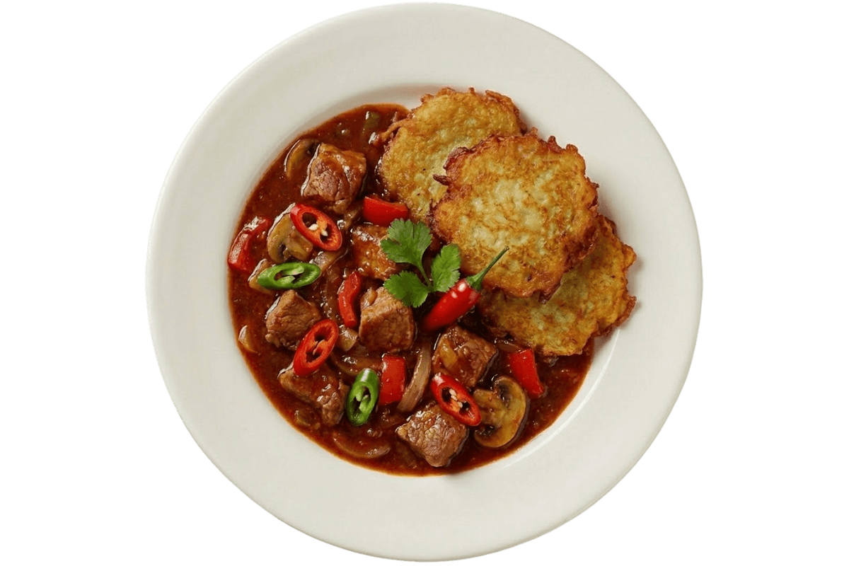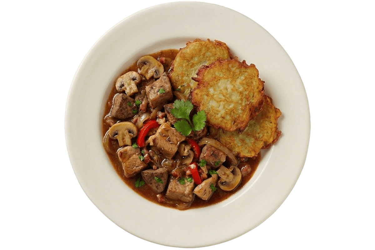 Vepřová játra, cibule, kapie, žampiony, kečup, soja