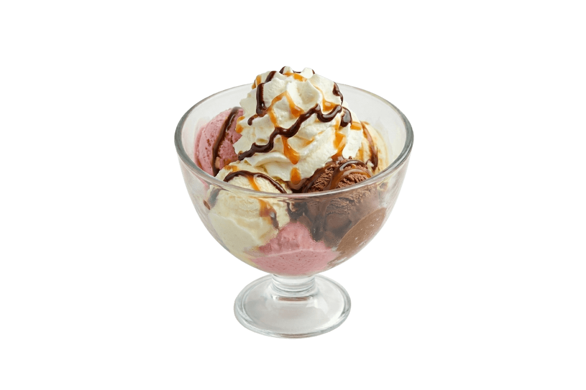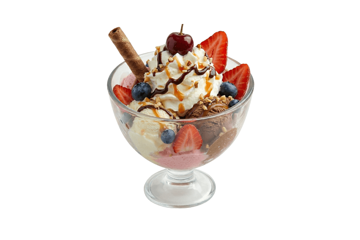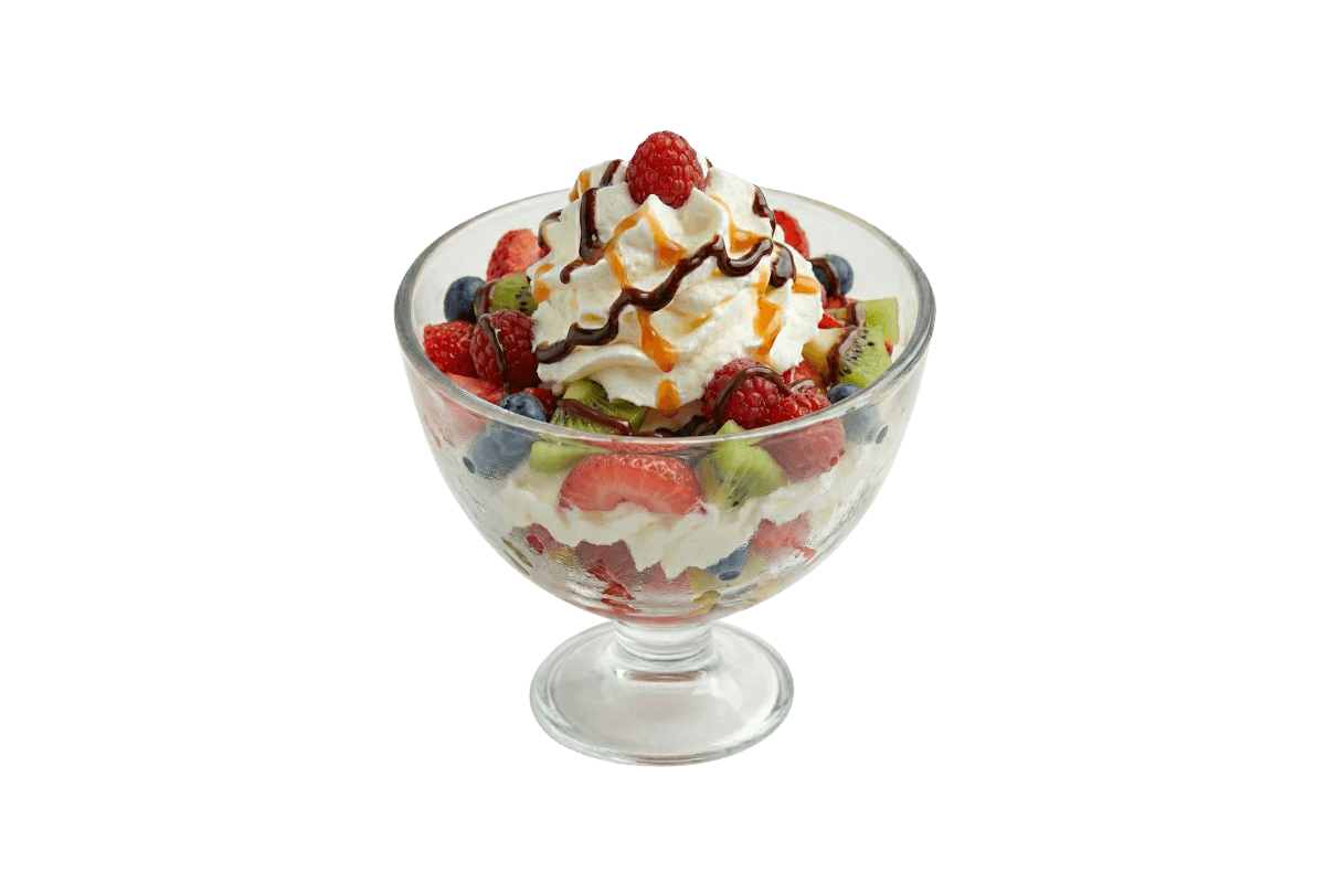 Zmrzlinový pohár s ovocem (jahody, broskve, ananas) a šlehačkou
