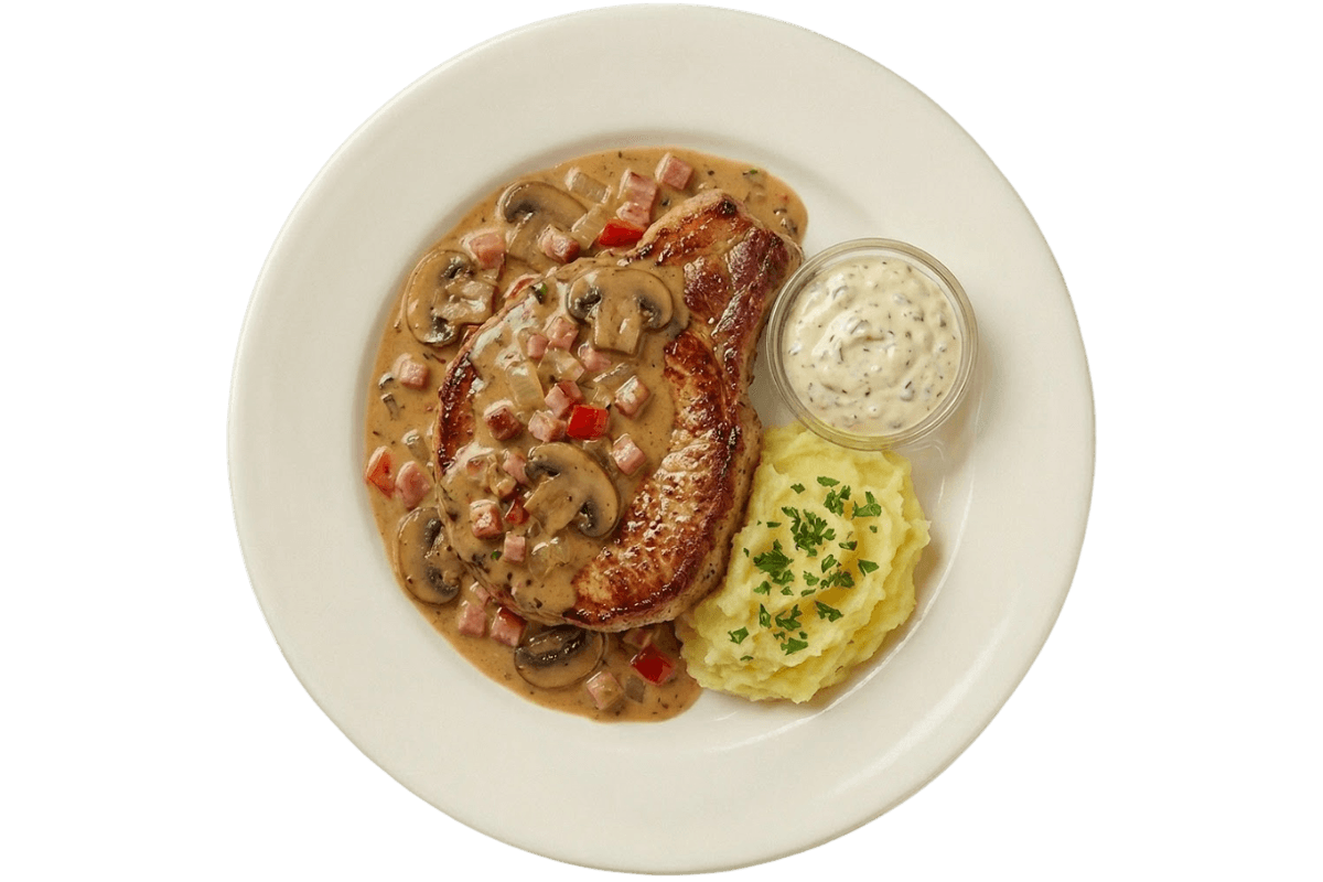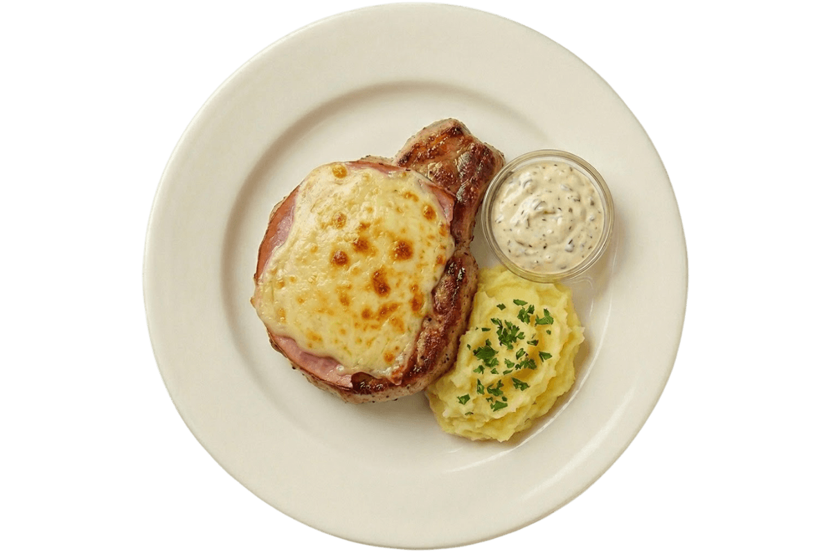 Vepřový steak zapečený šunkou a sýrem eidam, velká obloha