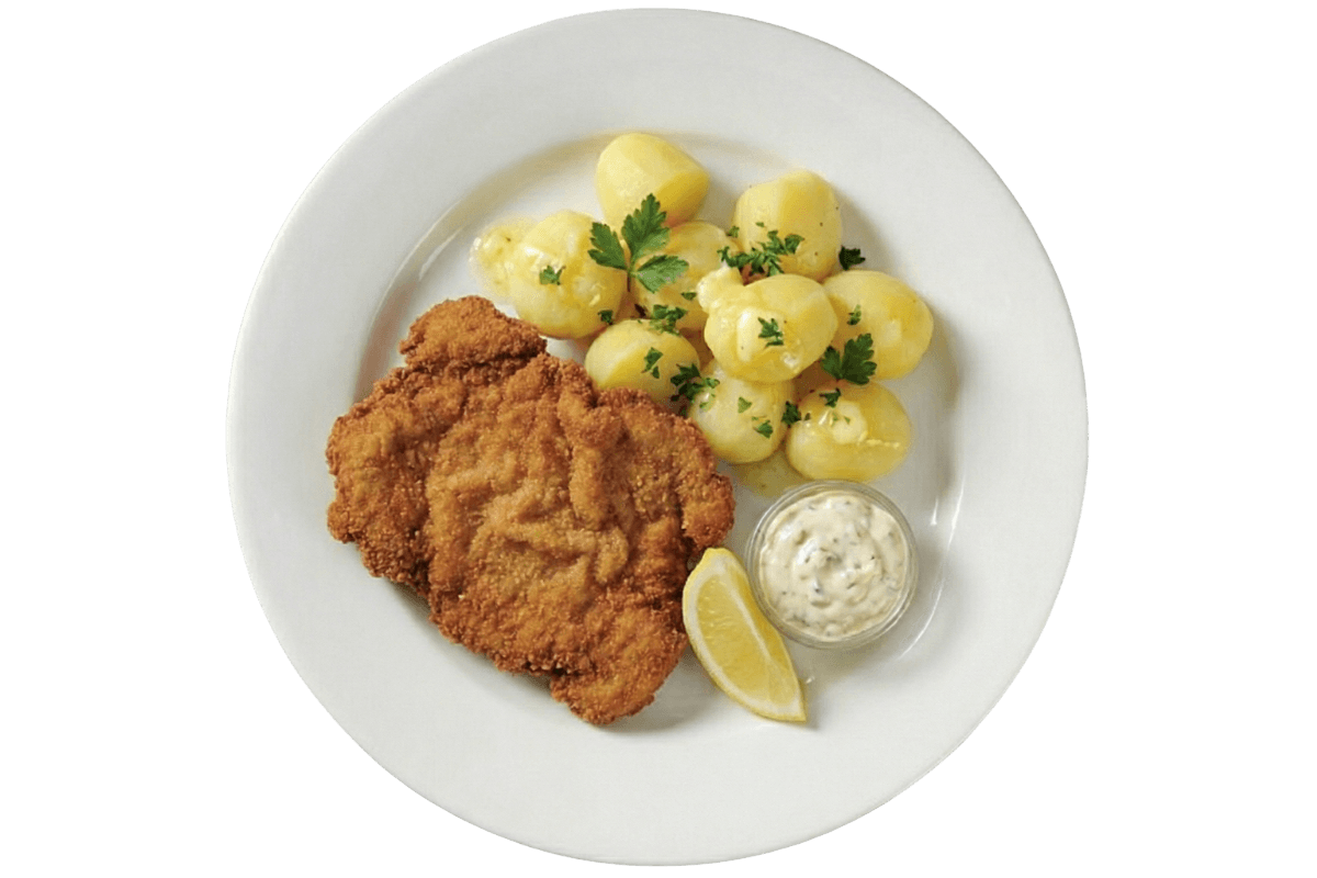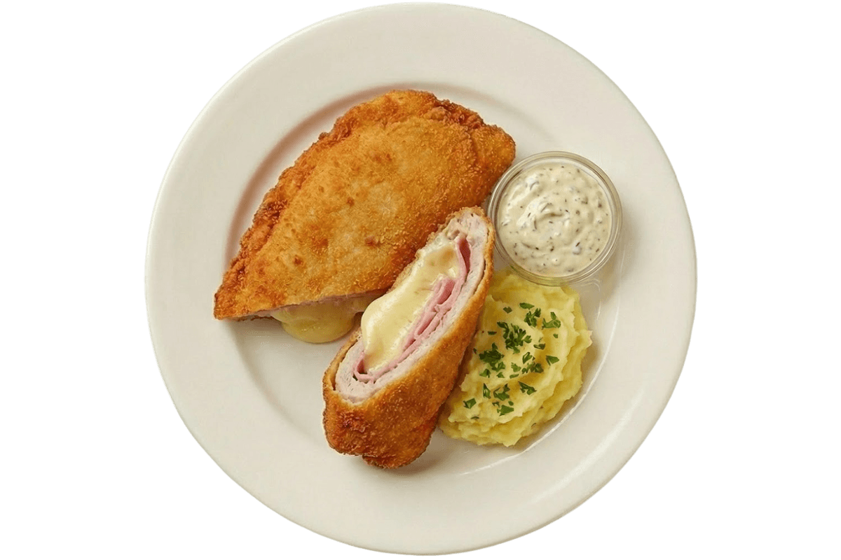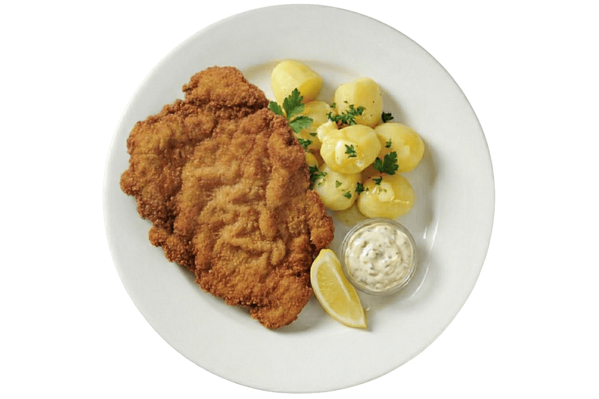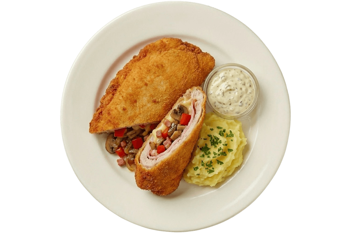 Smažený hermelínem se šunkou, tatarská omáčka, velká obloha