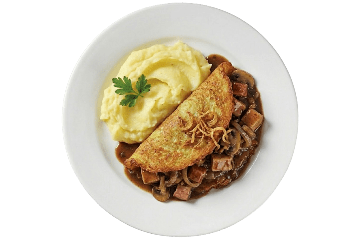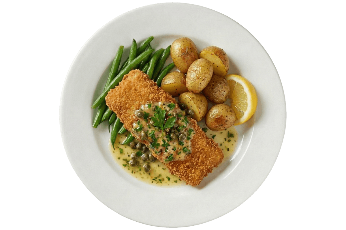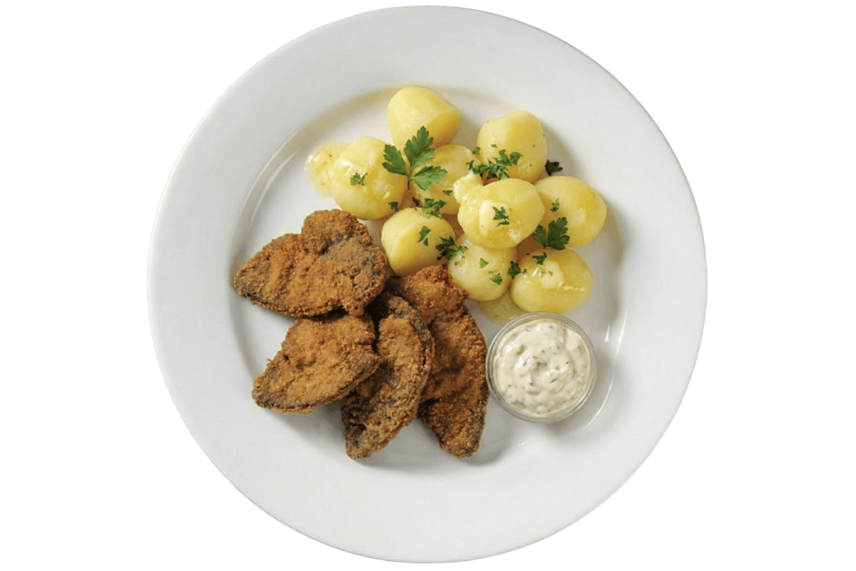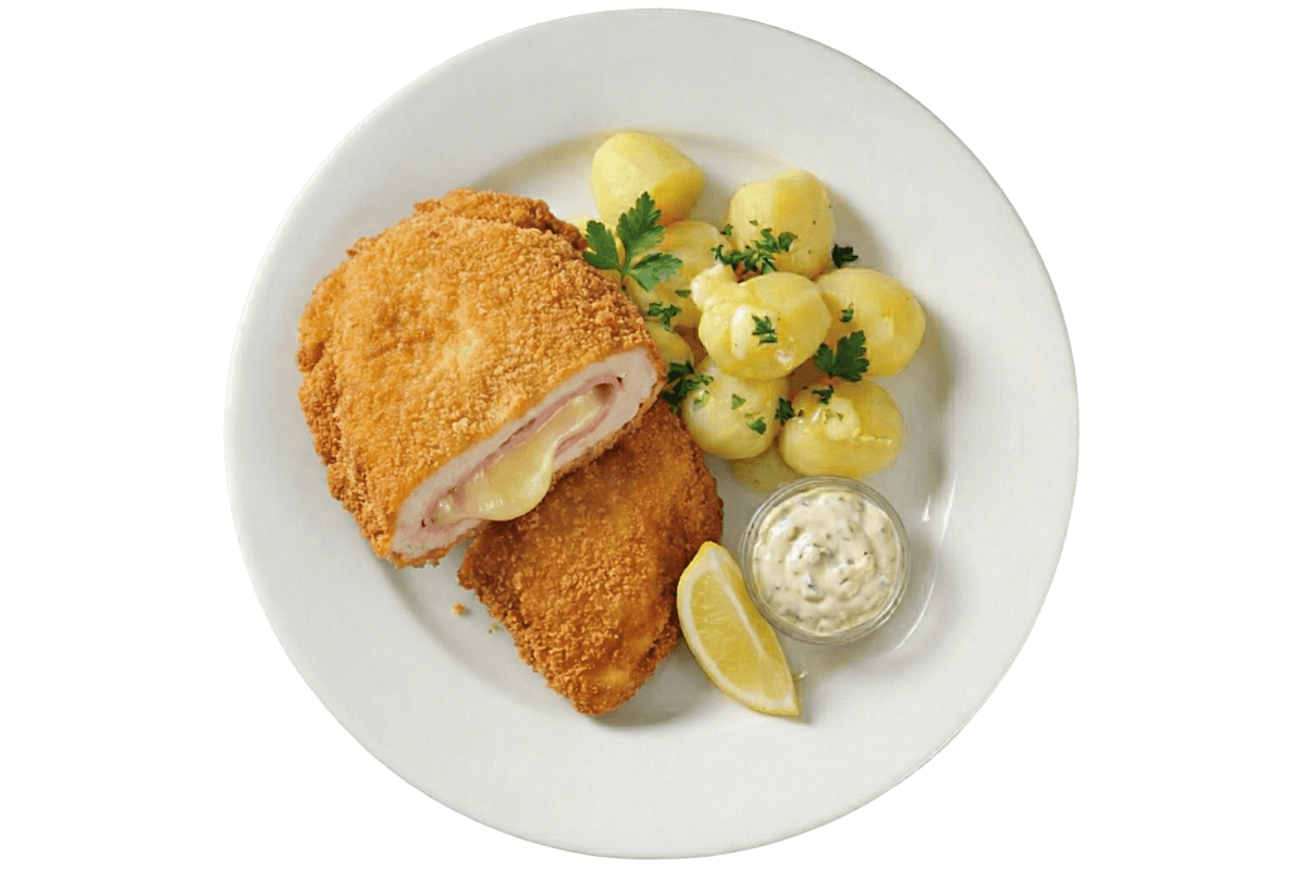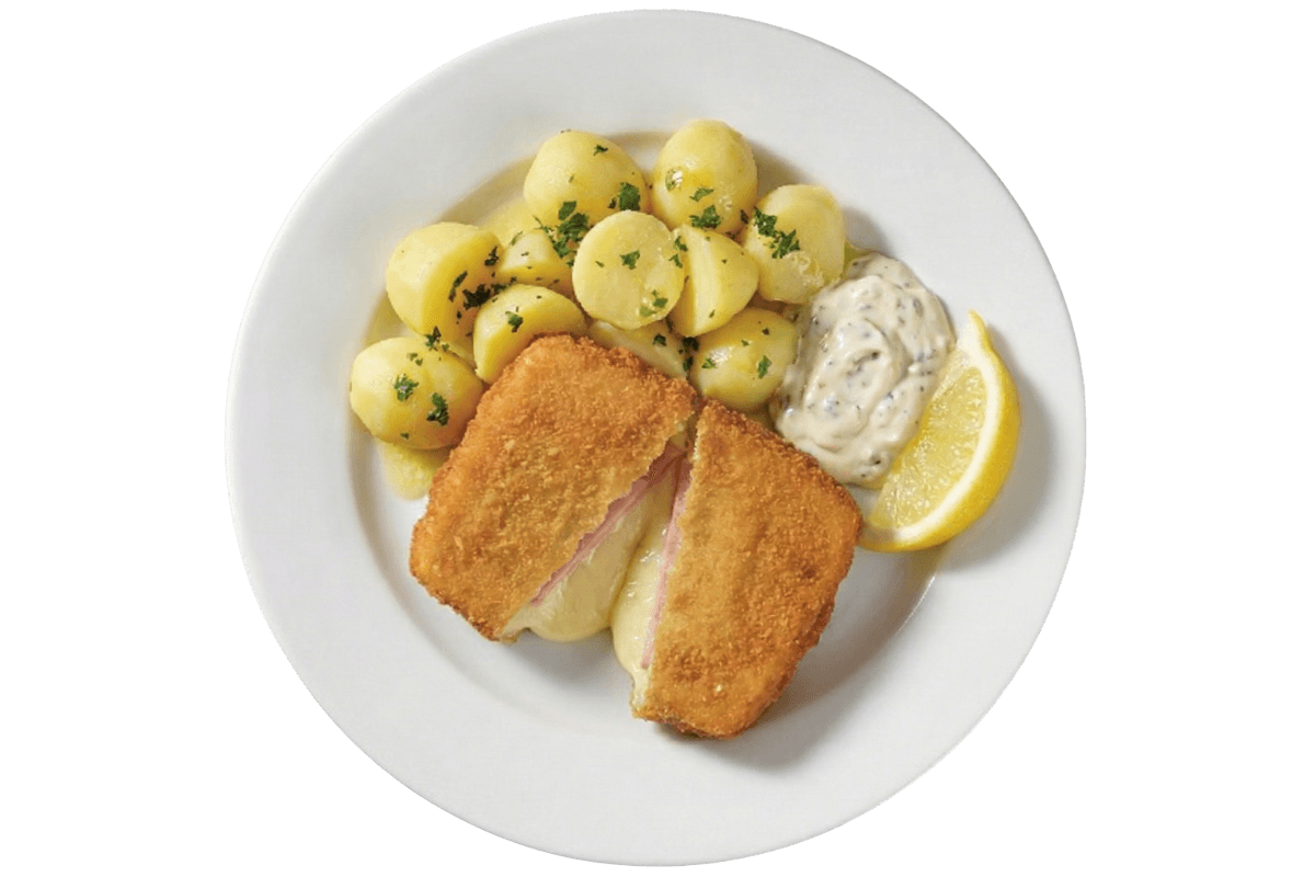 Smažený hermelínem se šunkou, tatarská omáčka, velká obloha