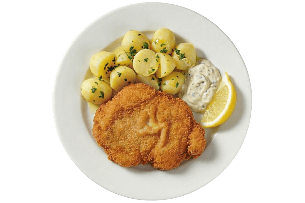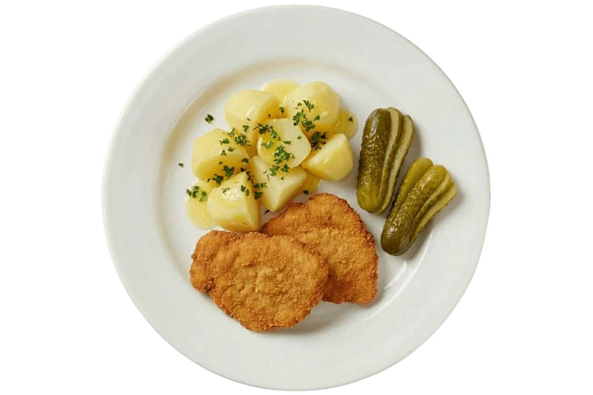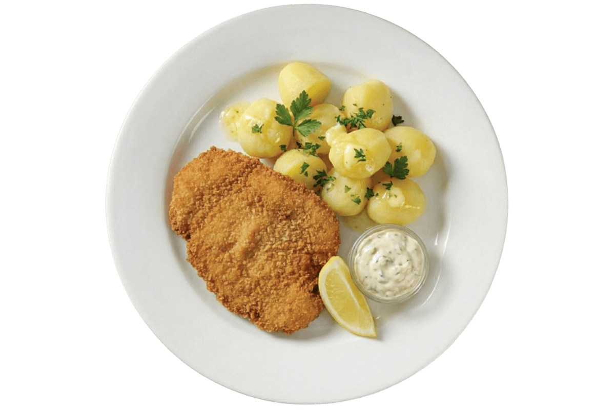 Holandský řízek, brambor/bramborový salát, okurka, obloha