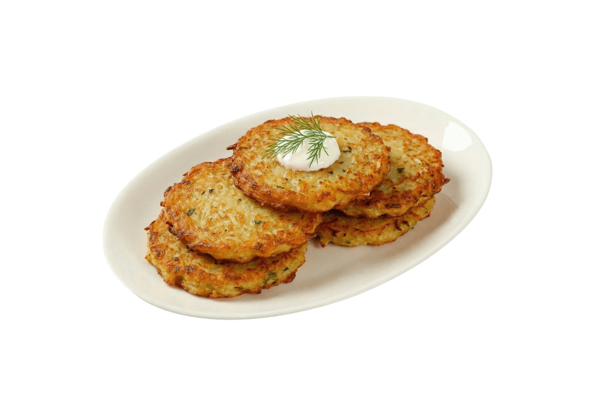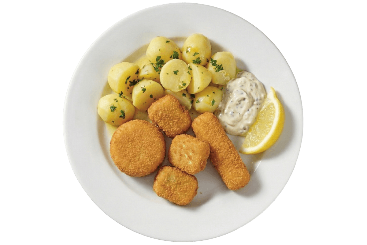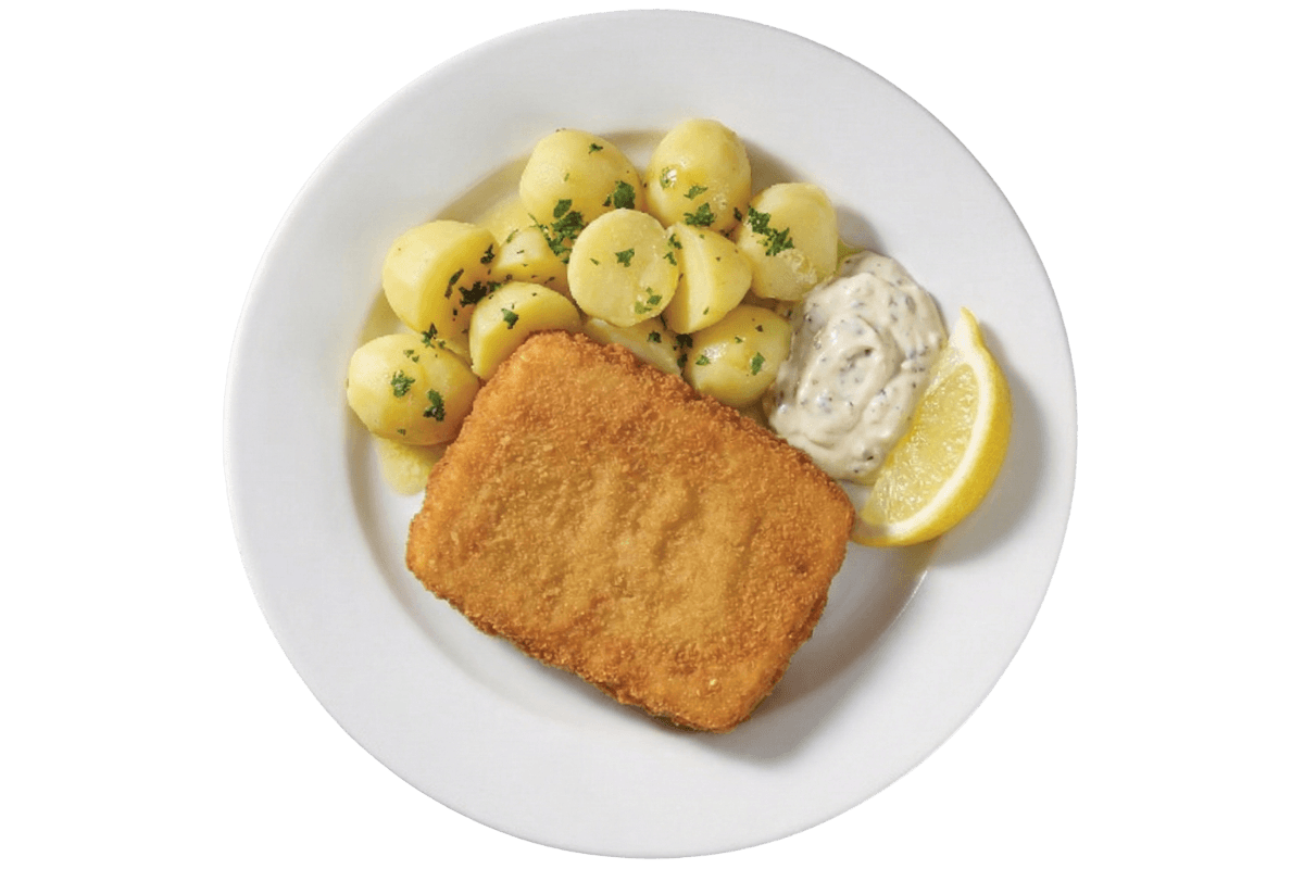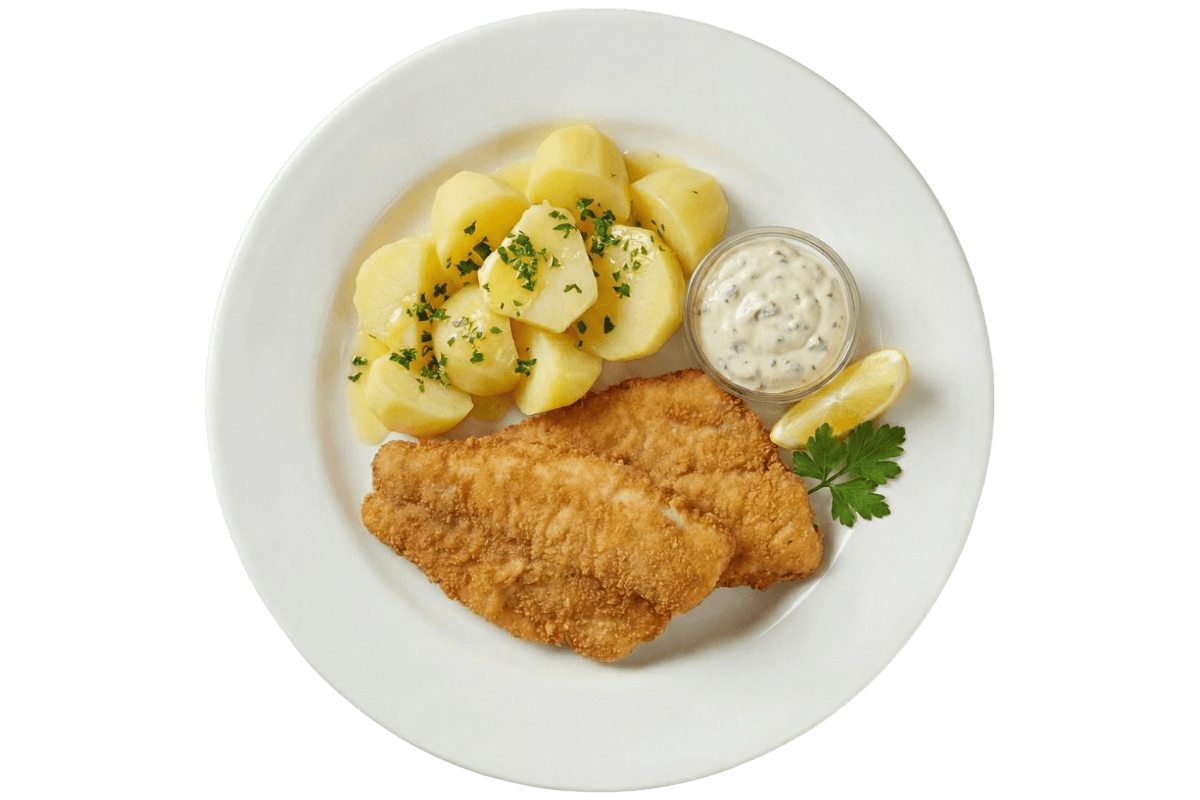 Holandský řízek, brambor/bramborový salát, okurka, obloha