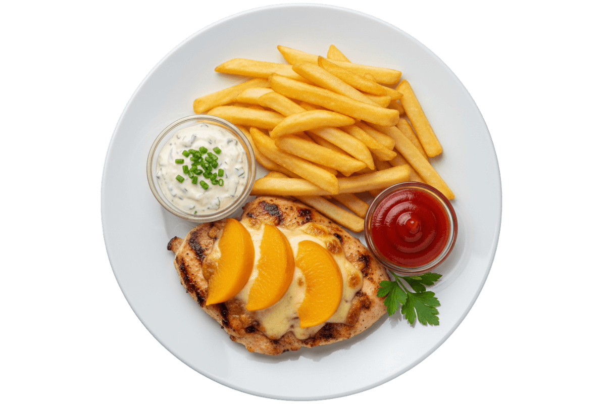 Zapečený kuřecí steak s broskví a sýrem, velká obloha