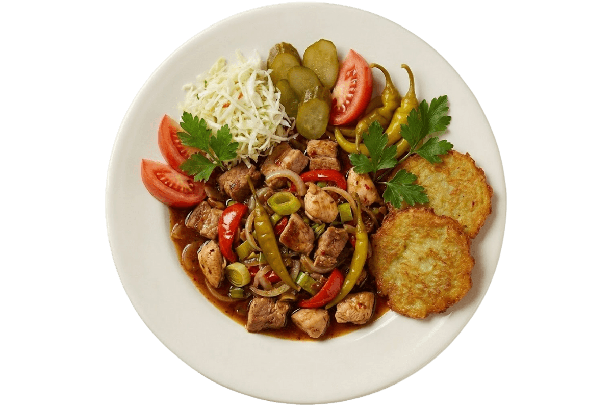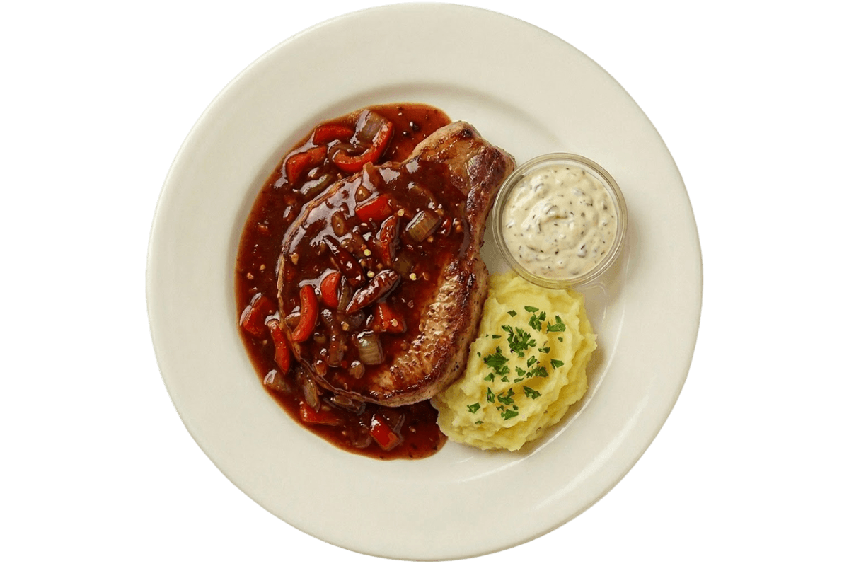 Vepřová kýta, feferonky, kečup, sojovka, kapie, cibule, velká obloha