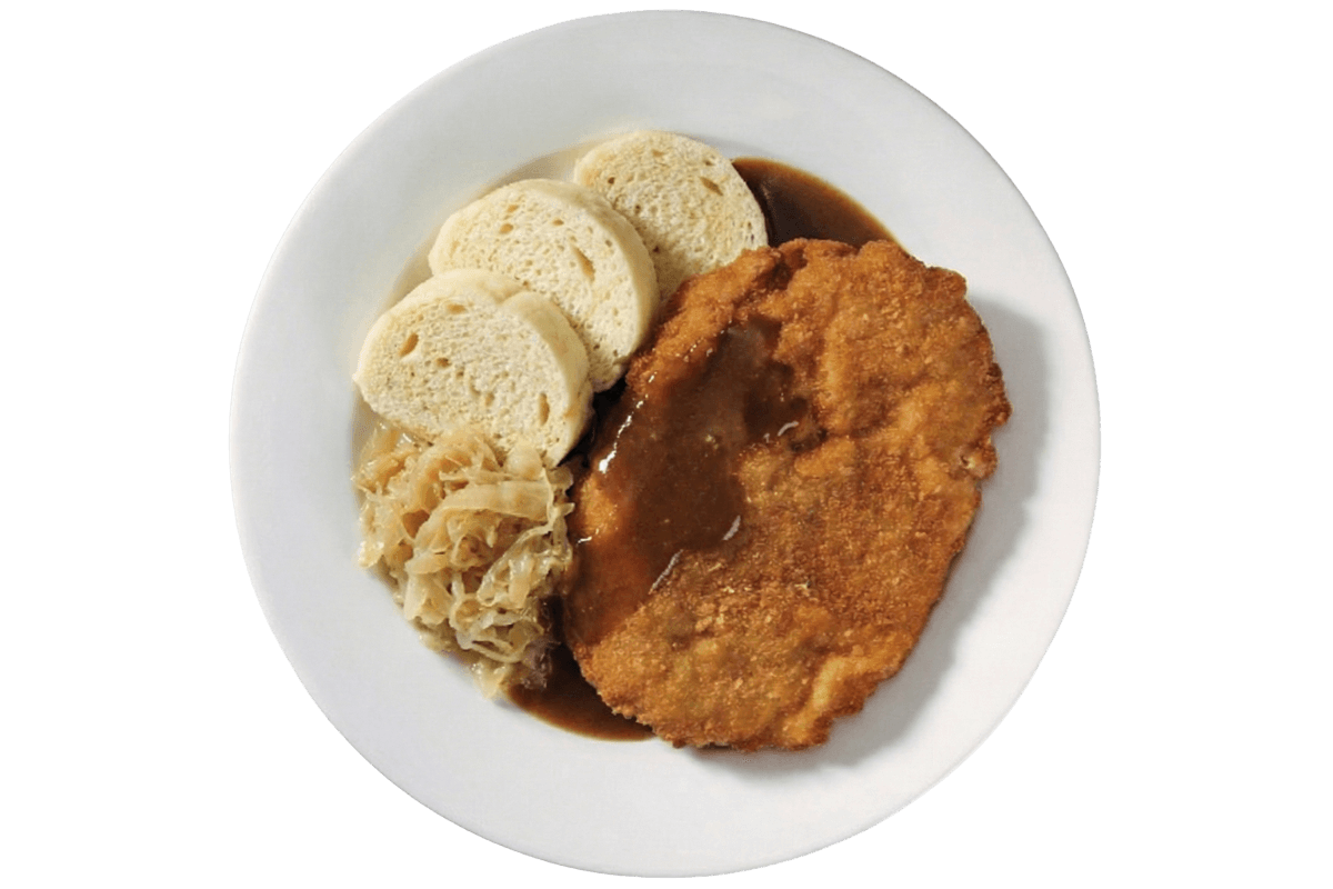 Vepřový řízek, houskový knedlík, zelí, šťáva